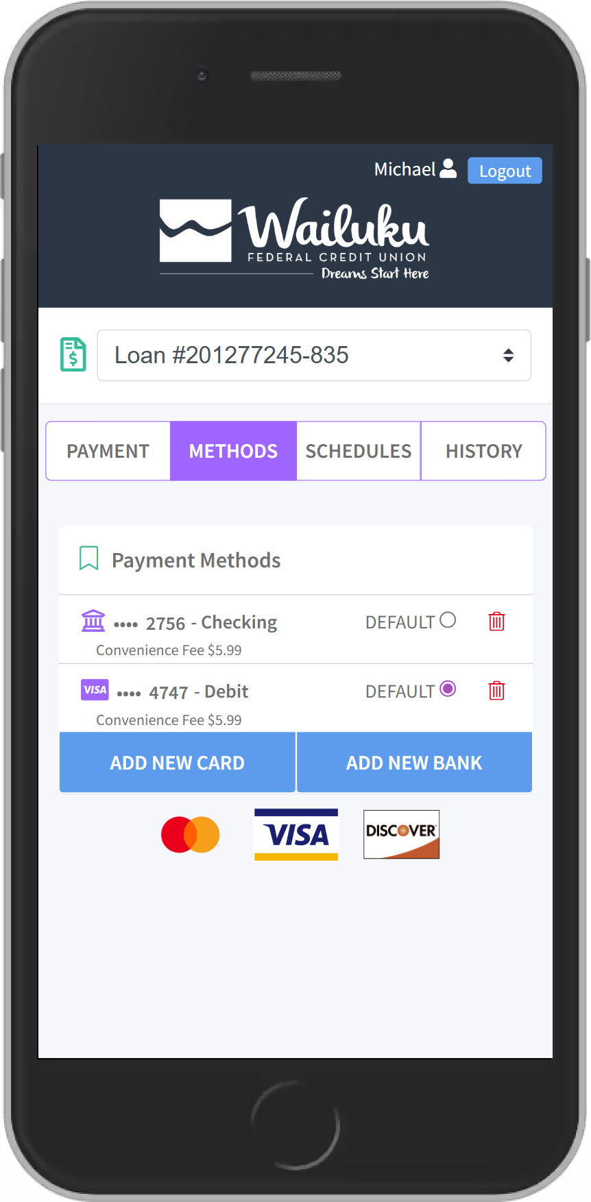 Wailuku FCU makes it easy to pay your loans from an external debit card or account. There is a $5.99 convenience fee per transaction.