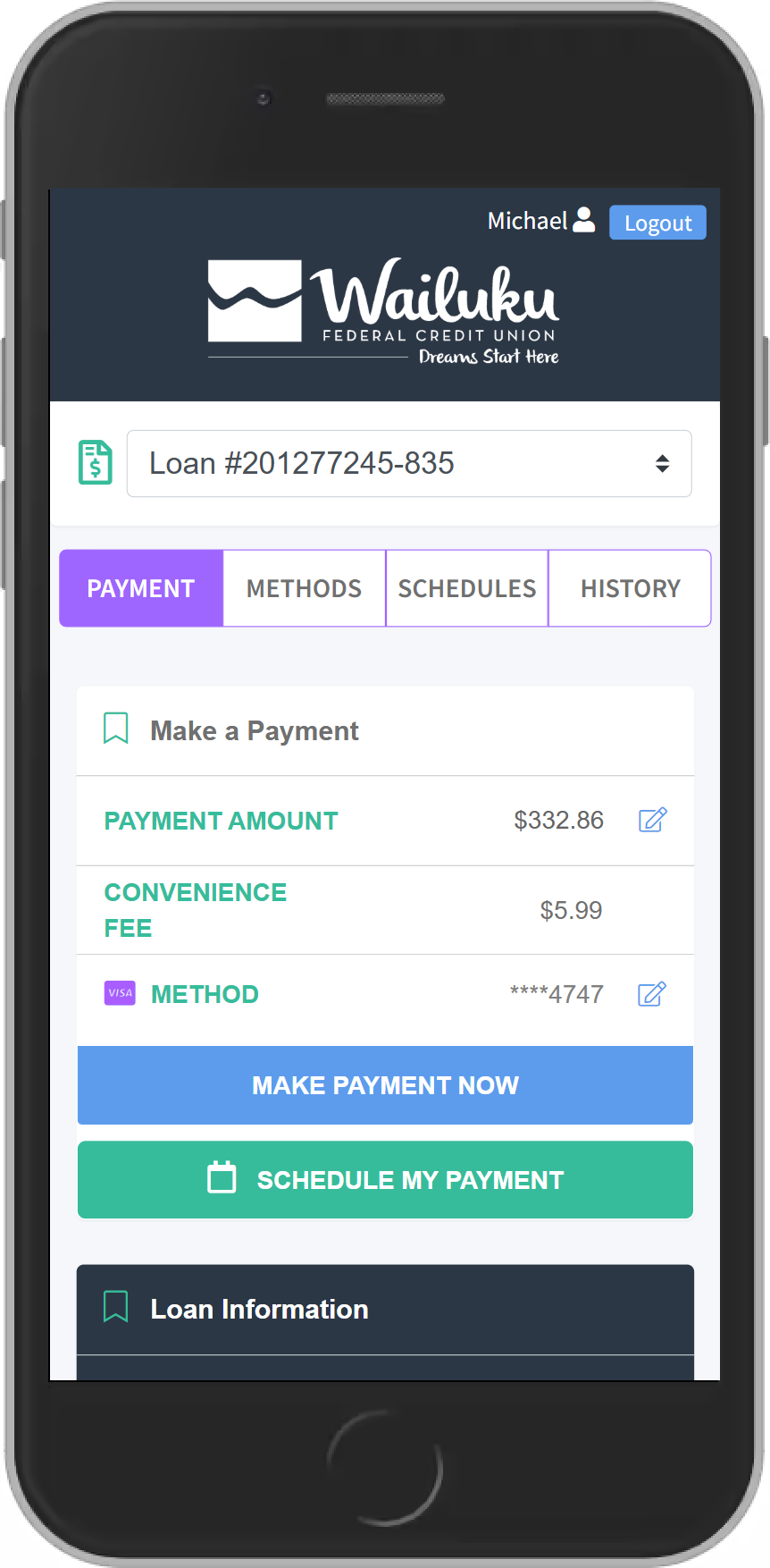 Wailuku FCU makes it easy to pay your loans from an external debit card or account. There is a $5.99 convenience fee per transaction.